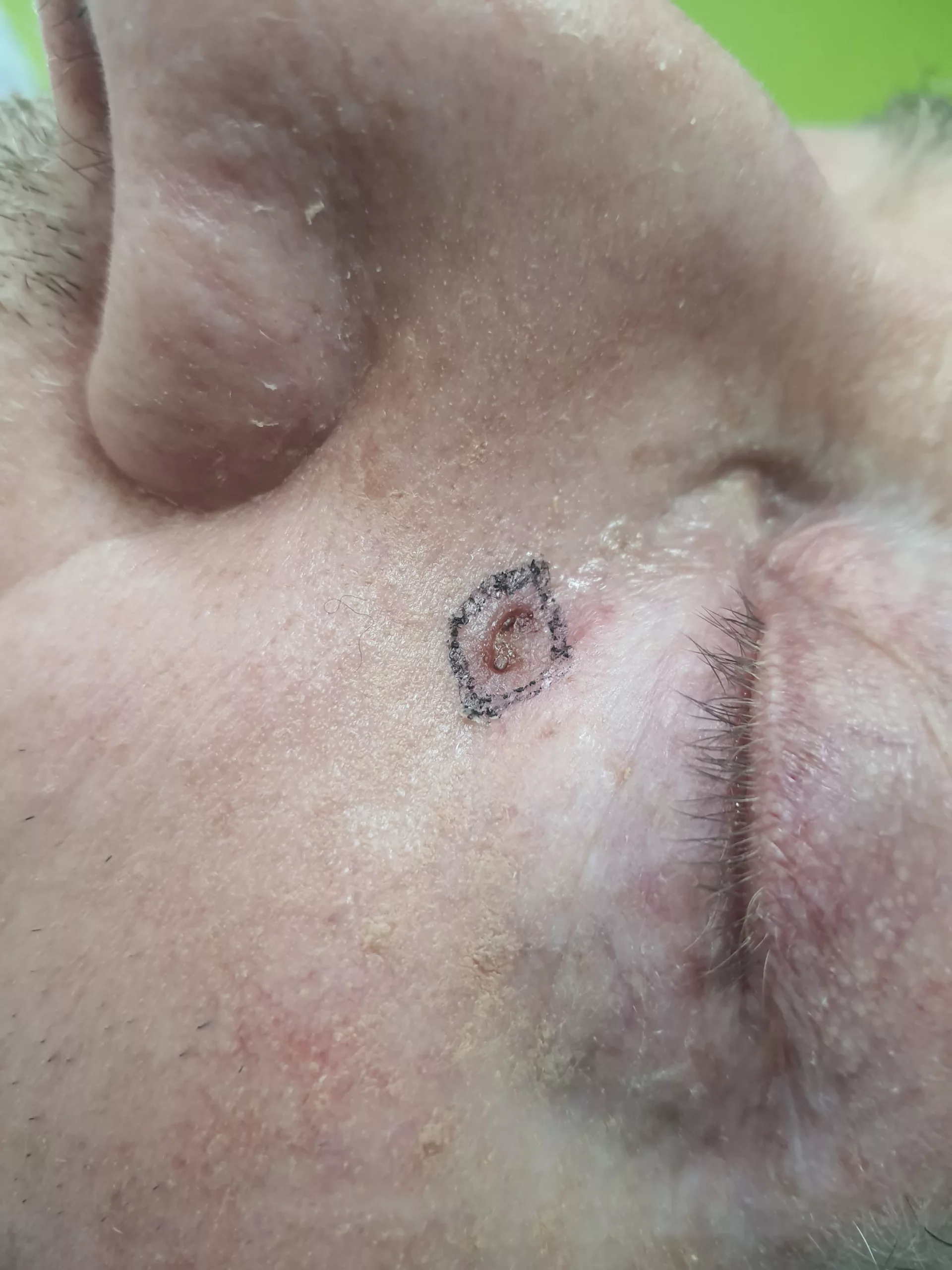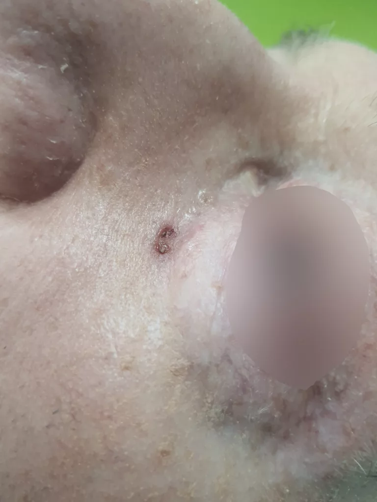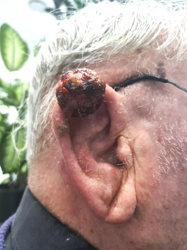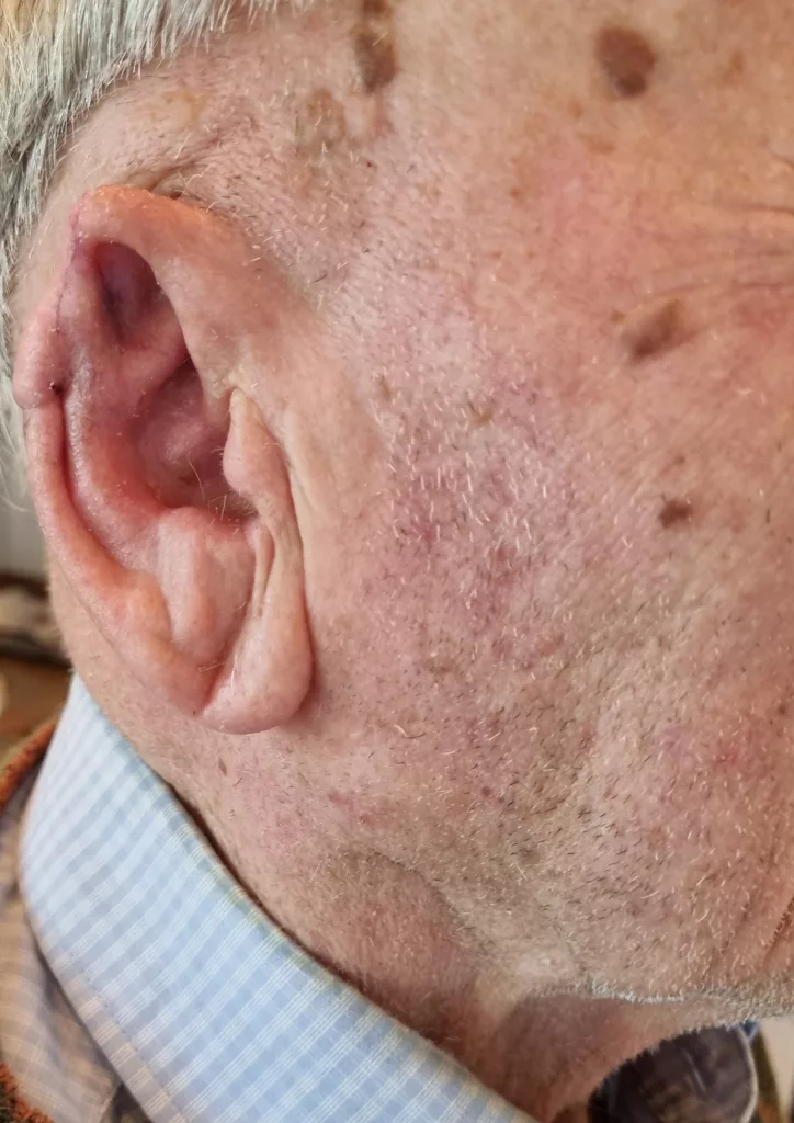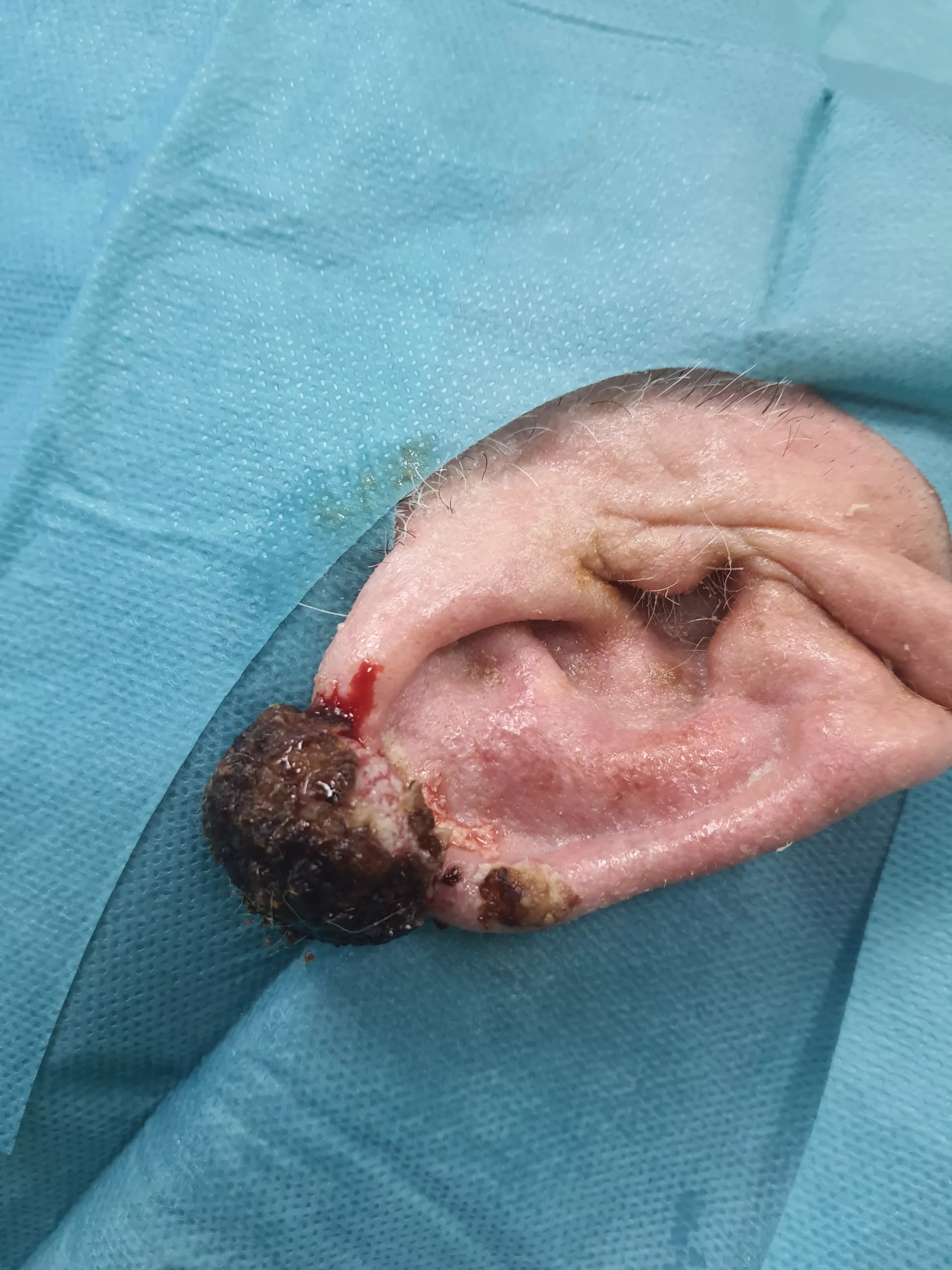 Bei diesem Fall handelte es sich um ein ausgeprägtes Stachelzellkarzinom. Die Entfernung erfolgte nach derselben bewährten Vorgehensweise wie zuvor, mit anschließender plastischer Rekonstruktion. Ziel war die vollständige Tumorentfernung bei gleichzeitiger Erhaltung von Form und Funktion des Ohres.