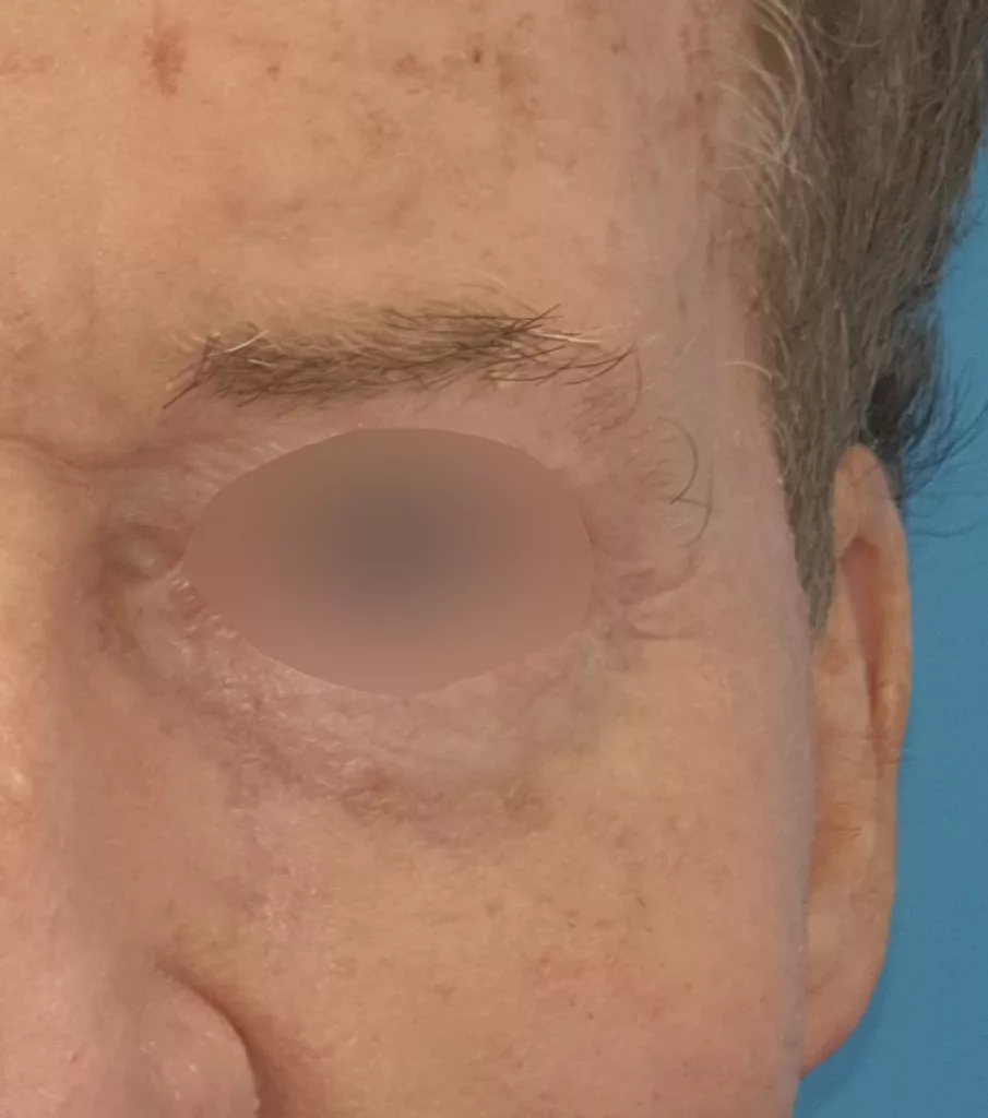 Nach zweimaliger Operation zur Entfernung des Basalioms erfolgte eine plastische Defektrekonstruktion unter örtlicher Betäubung. Die Wundheilung verläuft gut, die Funktion und Ästhetik des Unterlides werden bestmöglich erhalten.